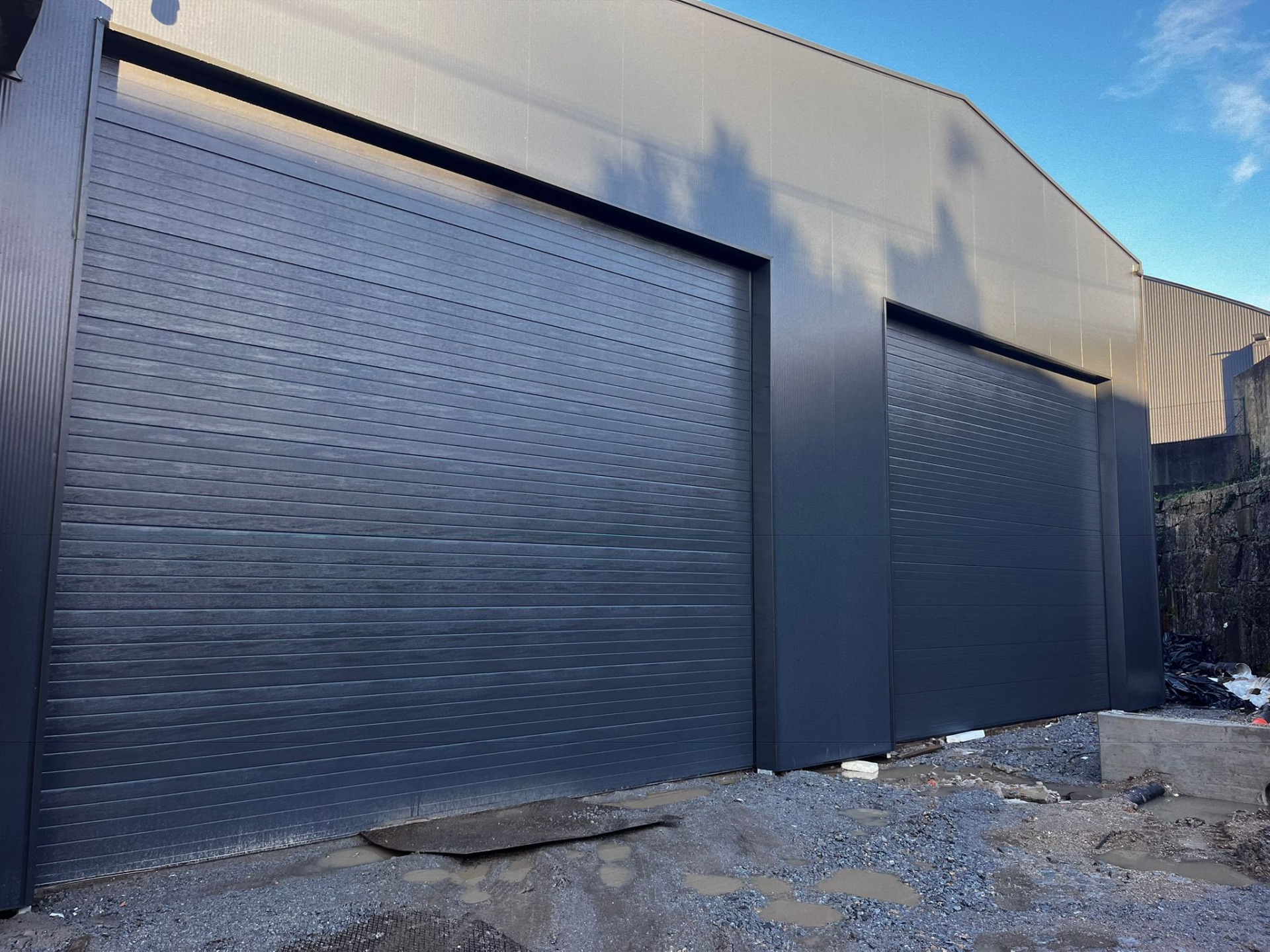 Portas Seccionadas Golfradas Cinza 9006 C/Visores em PVC e Porta de Serviço.