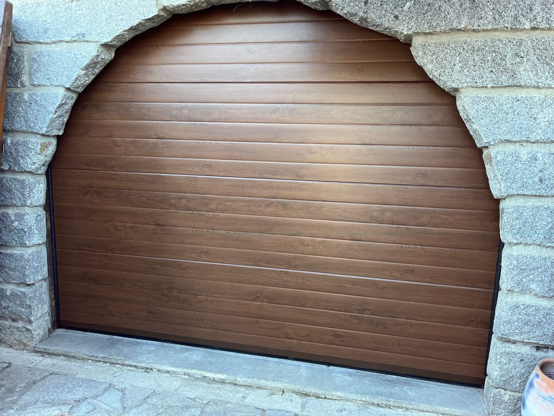 Porta Seccionada LisaCanelada Imitação Madeira Escura.